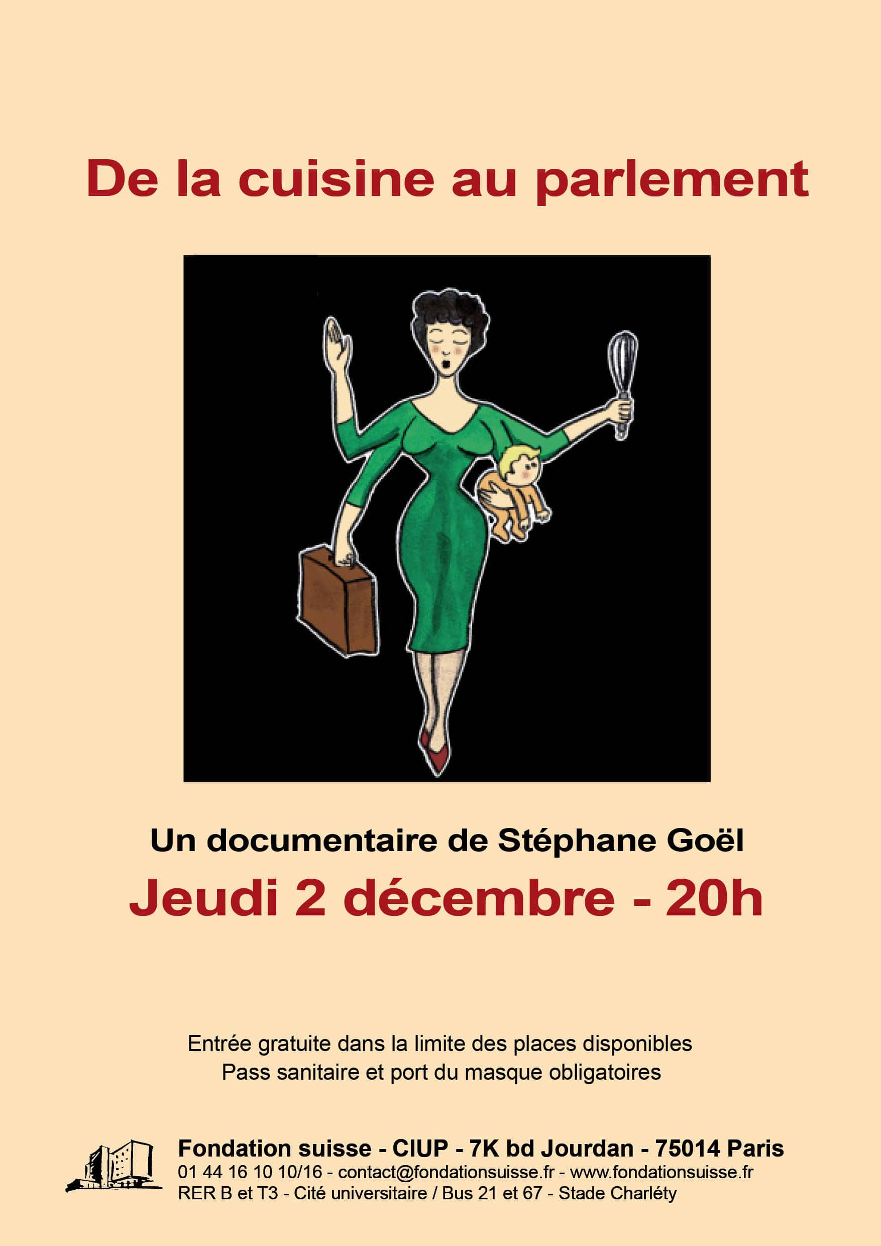 Projection du documentaire De la cuisine au parlement – Kinder, Küche, Politik de Stéphane Goël (Suisse, 2016, 67 min).