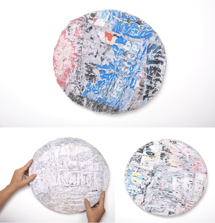 Des œuvres légères de papier se présentent suspendues au mur avec un simple système d’accrochage. Ces œuvres proviennent de documents de papier récupérés au Québec et en France. Ces documents, des affiches publicitaires touristiques et des cartes marines, routières et topographiques, ont subi des transformations de découpage, de collage et de ponçage qui en modifient notre lecture. Contenant de l’information écrite en français, les œuvres témoignent de fragments de notre époque et proposent de voir autrement la matérialité de l’information imprimée que nous côtoyons au quotidien.