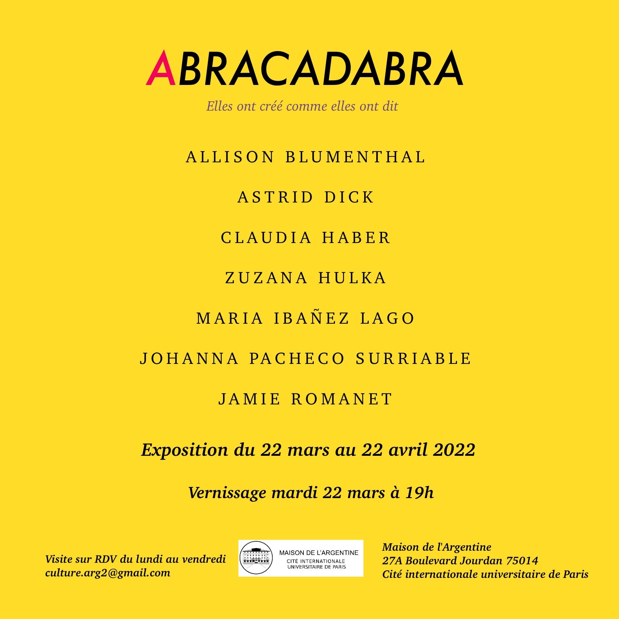 La Maison de l’Argentine accueillera la proposition de Claudia Haber, réunissant des œuvres de Allison Blumenthal, Astrid Dick, Claudia Haber, Zuzana Hulka, María Ibáñez Lago, Johanna Pacheco Surriable et Jamie Romanet.